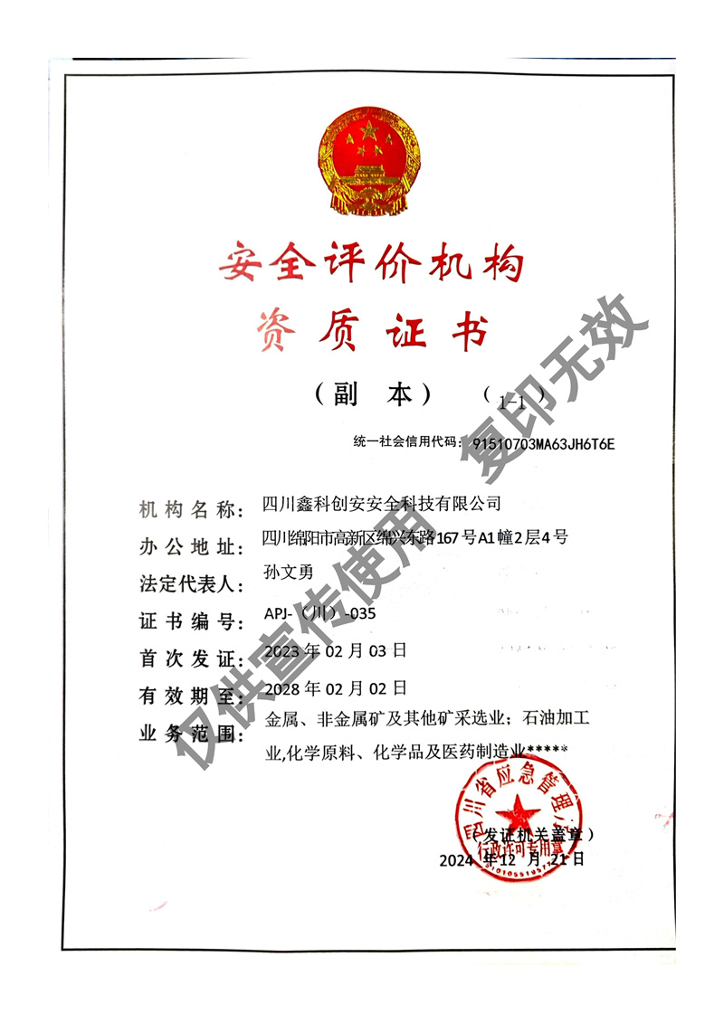 四川鑫科創(chuàng)安安全科技有限公司成立于2020年,是川北地區(qū)取得資質(zhì)的民營安全評價機(jī)構(gòu)(資質(zhì)證書編號:APJ-(川)-035)。并于2022年牽頭成立綜合應(yīng)急救援隊伍 - 綿陽曙光應(yīng)急救援中心。